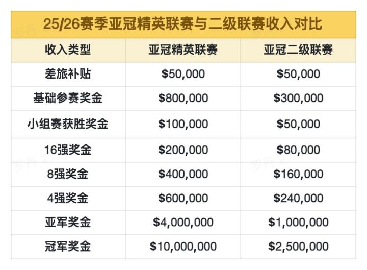 亚冠二级联赛与亚冠精英联赛在收入结构上整体类似,用以下表格就可以直观地呈现出两级联赛之间的收入差距。