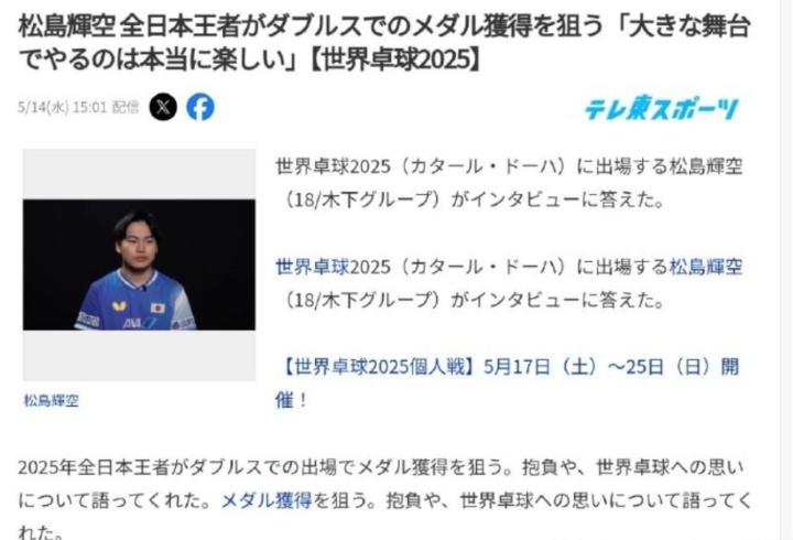 5月14日,据日媒报道,18岁松岛辉空在采访中表示:“在大舞台比赛真的很开心,目标是在双打和混双项目中夺取奖牌,重中之重是拿到金牌,会为此全力以赴。”混双签表,王楚钦/孙颖莎与松岛辉空/张本美和同处一个1/4区。