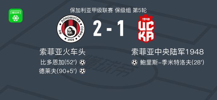 在北京时间5月14日进行的保加利亚甲级联赛保级组第5轮比赛中,索菲亚火车头主场迎战索菲亚中央陆军1948。比赛中,索菲亚中央陆军1948由鲍里斯-季米特洛夫率先打破僵局。随后,索菲亚火车头展开反击,比多恩加在德莱夫的助攻下扳平比分。补时阶段,德莱夫打入制胜一球,帮助球队完成逆转。最终,索菲亚火车头以2-1战胜索菲亚中央陆军1948。