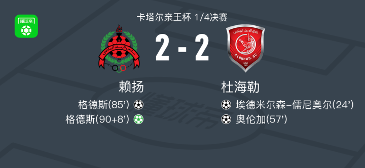 在北京时间5月15日进行的卡塔尔亲王杯1/4决赛中,赖扬与杜海勒展开较量。比赛中,杜海勒由埃德米尔森-儒尼奥尔率先建功,随后奥伦加接埃德米尔森-儒尼奥尔助攻再下一城。赖扬方面,格德斯表现出色完成梅开二度,尤其在比赛最后阶段通过点球为球队锁定平局。最终,双方以2-2的比分结束比赛。