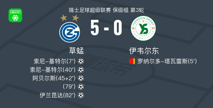北京时间5月15日瑞士足球超级联赛 保级组 第3轮,草蜢主场对阵伊韦尔东。草蜢索尼-基特尔梅开二度,阿贝尔斯破门,伊兰昆达破门。最终比分草蜢 5-0 伊韦尔东。