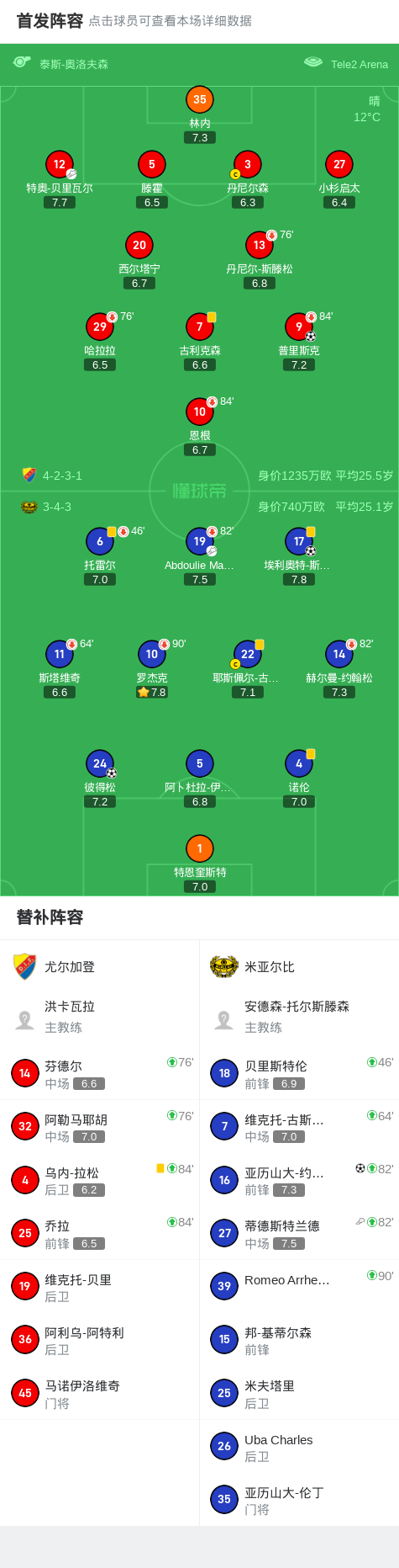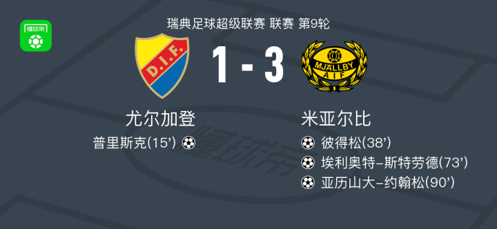 第90分钟,米亚尔比球员蒂德斯特兰德助攻亚历山大-约翰松打入一球。