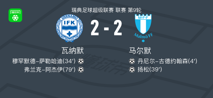 瑞典足球超级联赛第9轮,瓦纳默主场迎战马尔默。比赛中,马尔默由丹尼尔-古德约翰森率先打破僵局,随后瓦纳默的穆罕默德-萨勒哈迪迅速还以颜色扳平比分。紧接着,马尔默的扬松再度帮助球队取得领先。然而,瓦纳默的弗兰克-阿杰伊在比赛后段建功,最终将比分定格为2-2,双方各取一分。