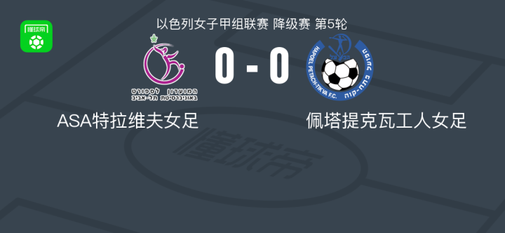 ASA特拉维夫女足0-0佩塔提克瓦工人女足,难分伯仲战报bot @懂球帝2025-05-16 03:34北京时间5月16日,以色列女子甲组联赛降级赛第5轮,ASA特拉维夫女足主场迎战佩塔提克瓦工人女足。全场比赛双方均未能取得进球,最终以0-0的比分握手言和。点击查看本场比赛详细数据>> 技术统计 展开更多