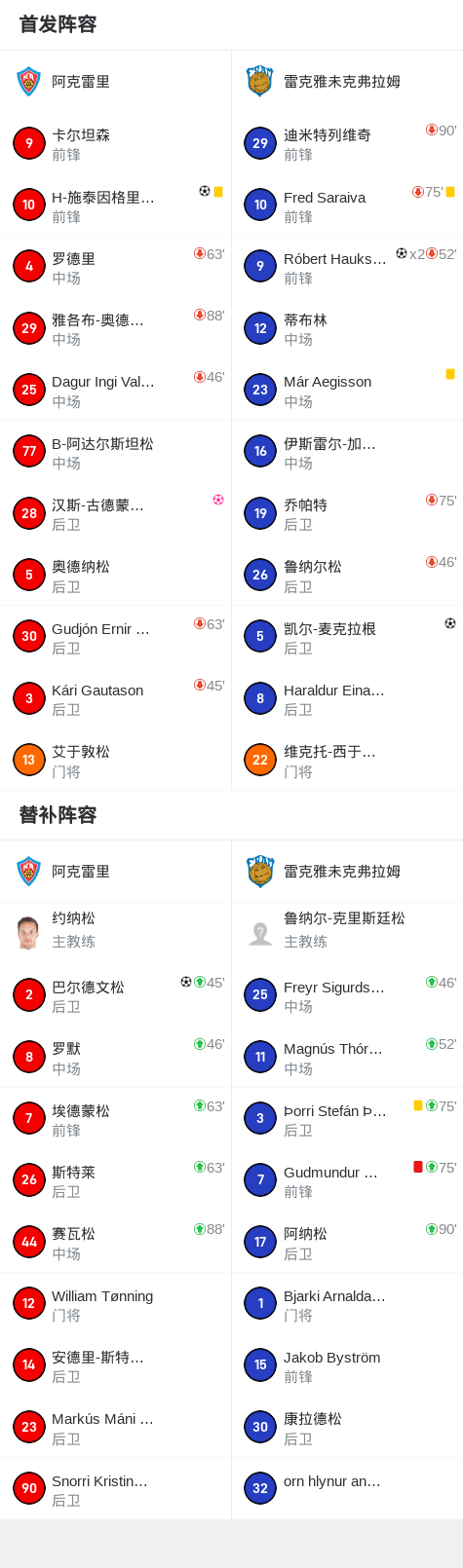 第58分钟,阿克雷里球员汉斯-古德蒙德松自摆乌龙。