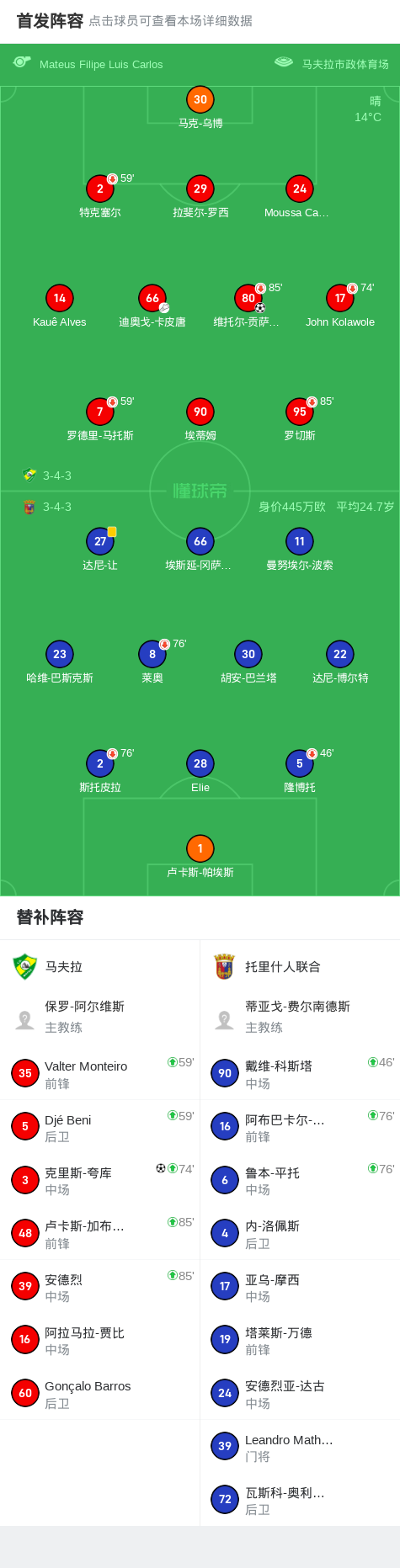 上半场补时第3分钟,马夫拉球员迪奥戈-卡皮唐助攻维托尔-贡萨尔维斯打入一球。
