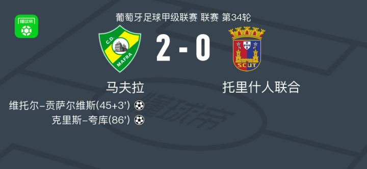 北京时间5月16日,葡萄牙足球甲级联赛第34轮,马夫拉主场迎战托里什人联合。比赛中,马夫拉凭借维托尔-贡萨尔维斯的进球取得领先,随后克里斯-夸库再入一球锁定胜局。最终,马夫拉以2-0战胜托里什人联合。