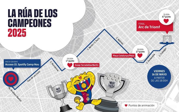 巡游的起点设在诺坎普球场第13号门附近的阿里斯蒂德斯-马约尔大道,终点则是凯旋门,终极庆典预计将于晚上21:30举行。巴萨一线队的巴士将途经特拉维塞拉-德莱斯科尔茨街与努曼西亚街,继续经过柏林街和巴黎街,然后沿巴尔梅斯街向下到佩莱街。随后,巡游大巴将穿过加泰罗尼亚广场与乌尔基纳奥纳广场,并最终沿特拉法加街与圣胡安大道抵达凯旋门。
