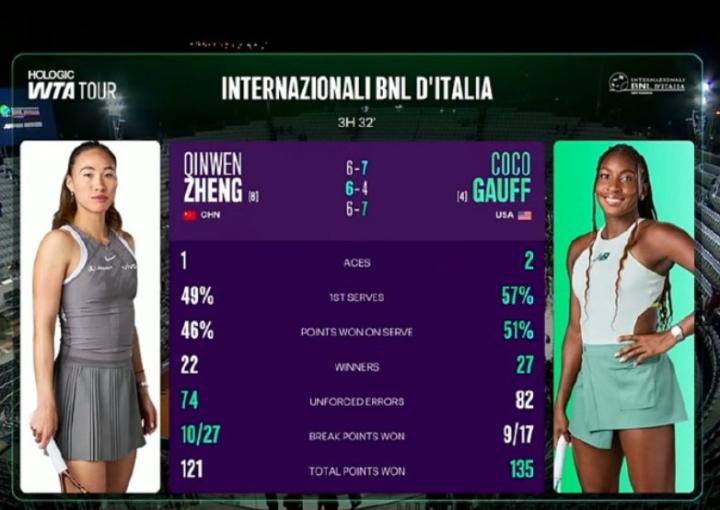郑钦文决胜盘抢七大战不敌高芙,遗憾无缘WTA1000罗马站决赛