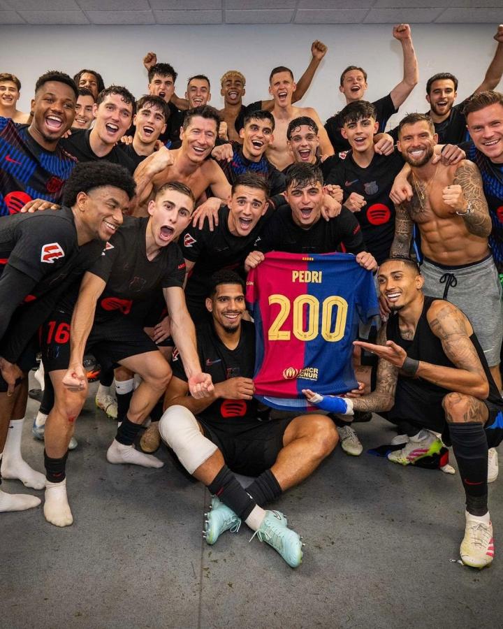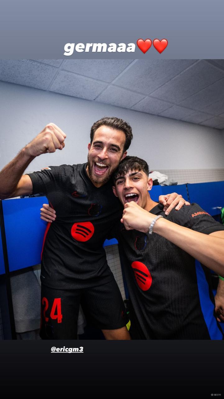 赛后,埃里克-加西亚在社交媒体晒出全队合照以及与贝尔纳尔的合照,并写道:“巴萨球迷们,西甲冠军属于红蓝军团了!!!!一起庆祝吧!!!