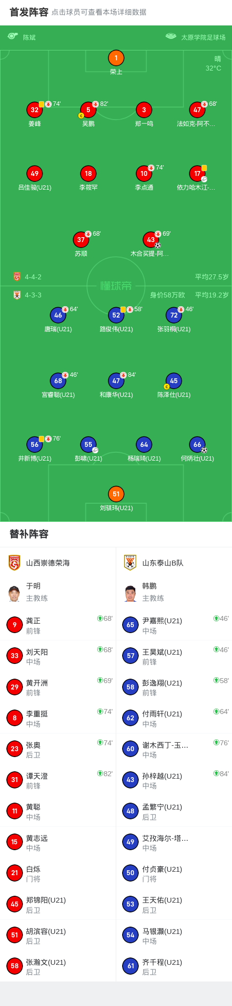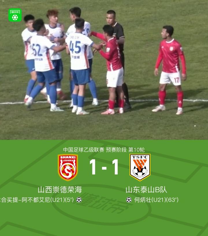 山西崇德荣海1-1山东泰山B队,木合买提、何炳壮破门