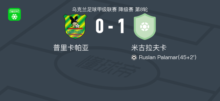 北京时间5月16日,乌克兰足球甲级联赛降级赛第8轮,普里卡帕亚主场迎战米古拉夫卡。比赛中,米古拉夫卡由Ruslan Palamar完成破门,为球队取得领先。最终,普里卡帕亚0-1不敌米古拉夫卡。
