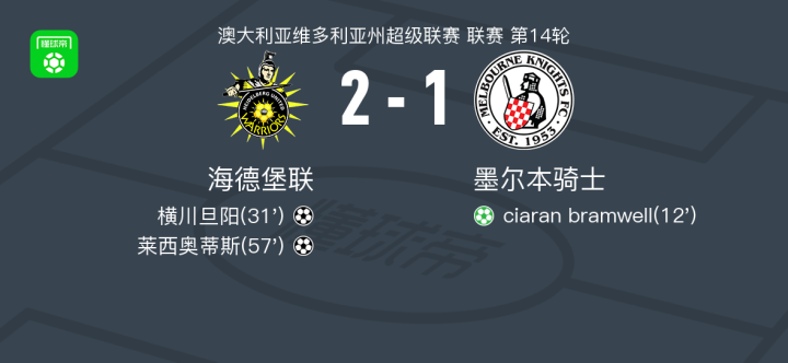 在北京时间5月16日进行的澳大利亚维多利亚州超级联赛第14轮比赛中,海德堡联主场迎战墨尔本骑士。比赛中,墨尔本骑士由ciaran bramwell通过点球机会打破僵局。随后,海德堡联展开反击,横川旦阳成功扳平比分,莱西奥蒂斯再入一球实现反超。最终,海德堡联以2-1战胜墨尔本骑士。
