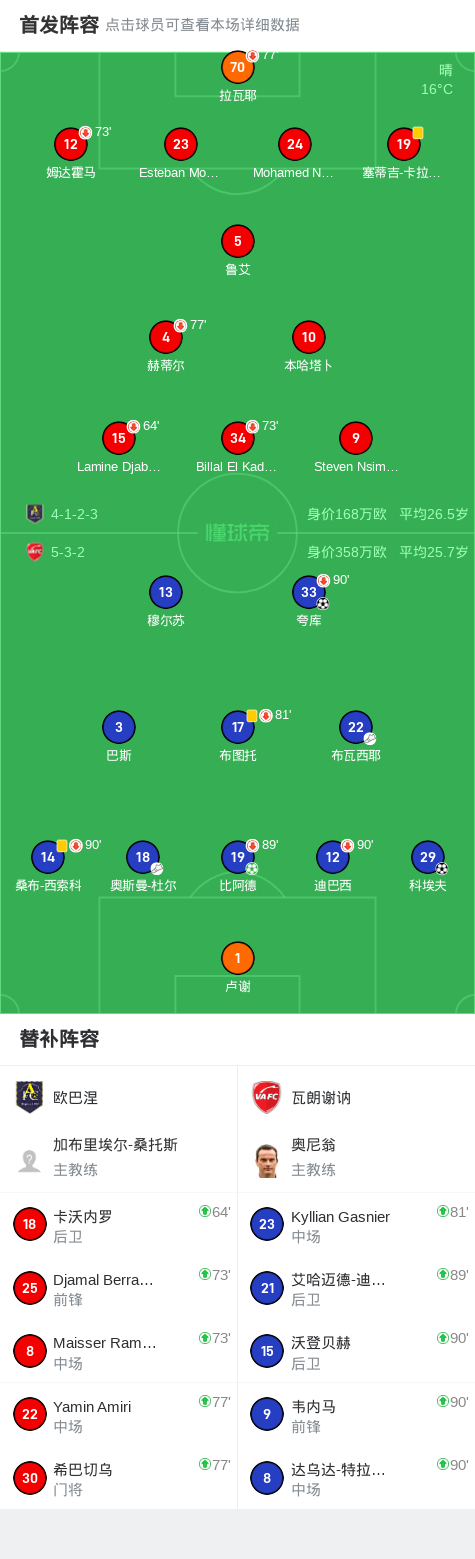瓦朗谢讷3-0大胜欧巴涅,夸库、科埃夫破门