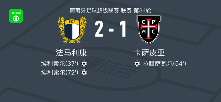 北京时间5月17日,葡萄牙足球超级联赛第34轮,法马利康主场迎战卡萨皮亚。比赛中,法马利康的埃利索尔表现出色,完成梅开二度,为球队奠定领先优势。卡萨皮亚方面,拉腊萨瓦尔成功破门,为客队追回一城。最终,法马利康以2-1战胜卡萨皮亚,全取三分。