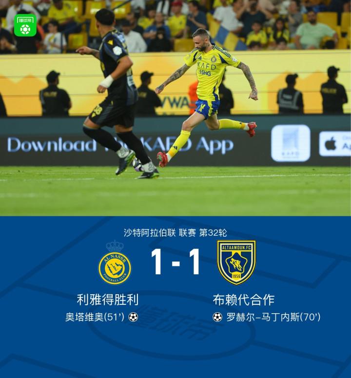北京时间5月17日沙特阿拉伯联 联赛 第32轮,利雅得胜利主场对阵布赖代合作。上半场,马内多次造险,头球攻门击中门框。穆萨-巴罗多次远射造威胁,但始终未能进球。下半场,奥塔维奥头球破门打破僵局。罗赫尔-马丁内斯低射破门将比分扳平。最终,利雅得胜利1-1战平布赖代合作。