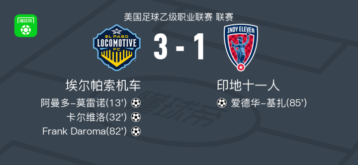 埃尔帕索机车3-1印地十一人,Frank Daroma建功,卡尔维洛破门