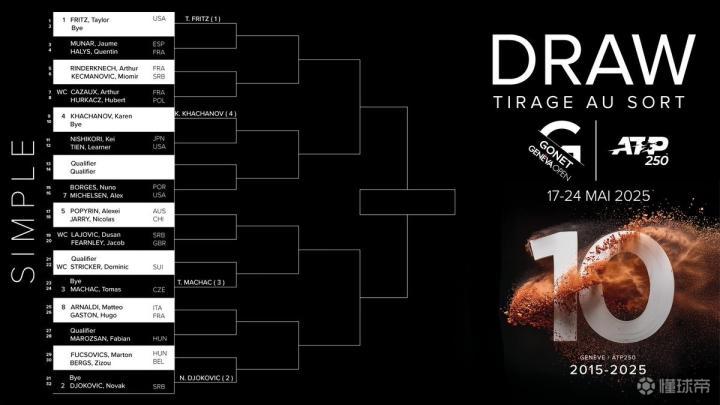 5月17日,下周开赛的ATP250日内瓦站签表出炉,前四号种子弗里茨、德约科维奇、马哈奇、卡恰诺夫首轮轮空。