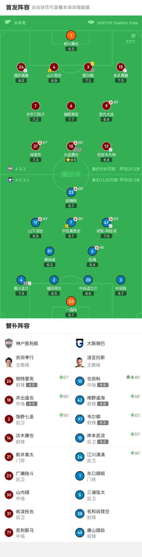第45+2分钟,神户前场反抢成功埃里克送出直塞,大迫勇也转身抽射破门,但因越位在先,进球无效。