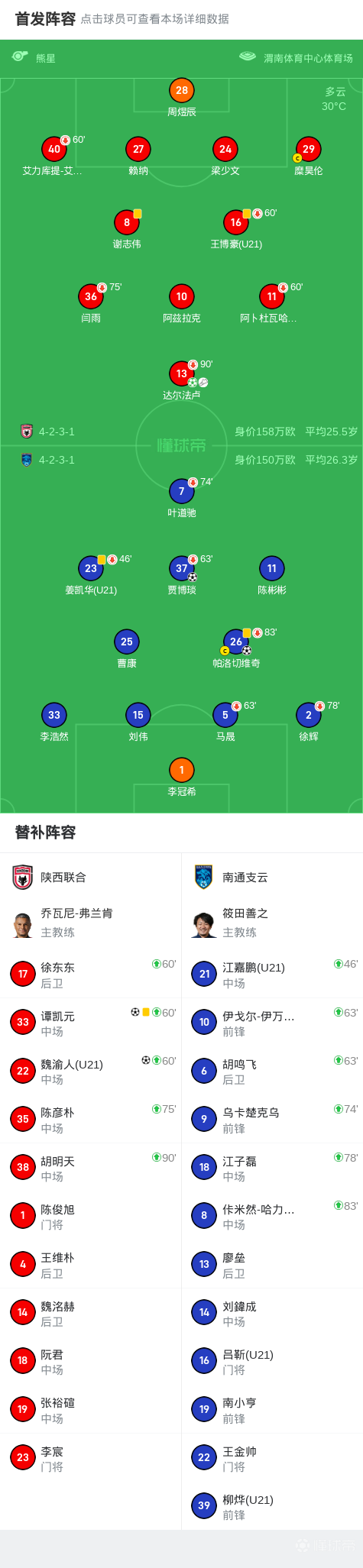 北京时间5月17日,中国足球甲级联赛第9轮,陕西联合主场迎战南通支云。上半场,贾博琰率先打破僵局,随后帕洛切维奇再下一城。下半场,陕西联合在比赛尾声展开强势反击,魏渝人打入一球缩小分差,随后在禁区内造点。达尔法卢主罚点球扳平比分。补时尾声,达尔法卢助攻谭凯元完成绝杀。最终,陕西联合以3-2逆转战胜南通支云。