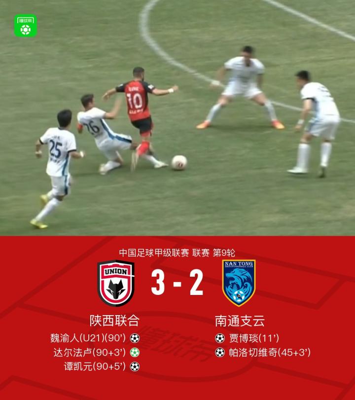 第90+5分钟,达尔法卢助攻,谭凯元扫射破门将比分逆转,陕西联合3-2
