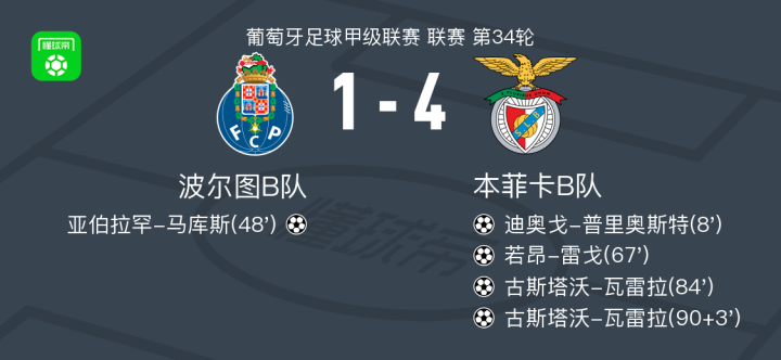 北京时间5月17日,葡萄牙足球甲级联赛第34轮,波尔图B队主场迎战本菲卡B队。比赛中,本菲卡B队的迪奥戈-普里奥斯特率先为球队取得领先。随后,波尔图B队由亚伯拉罕-马库斯扳平比分。然而,本菲卡B队的若昂-雷戈再次帮助球队超出。之后,古斯塔沃-瓦雷拉连入两球完成梅开二度,为本菲卡B队锁定胜局。最终,波尔图B队以1-4不敌本菲卡B队。