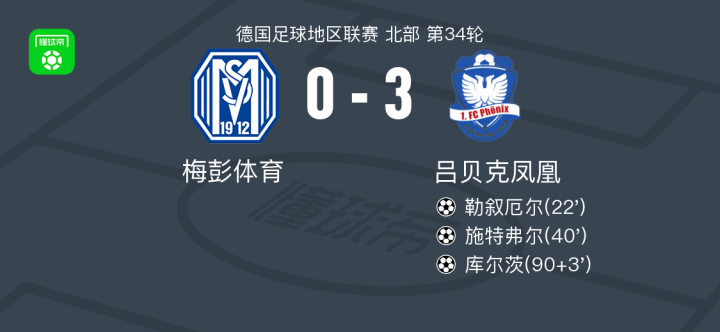 吕贝克凤凰3-0大胜梅彭体育,库尔茨、施特弗尔破门
