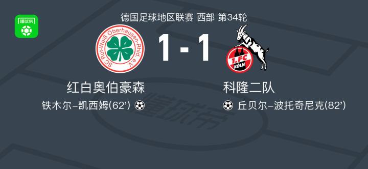 红白奥伯豪森1-1科隆二队,铁木尔-凯西姆首开记录,丘贝尔-波托奇尼克扳平比分