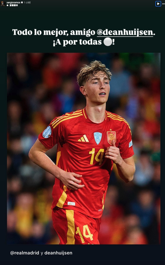 在皇马官宣签下西班牙中卫赫伊森后,前皇马队长拉莫斯在社交媒体送上祝福。