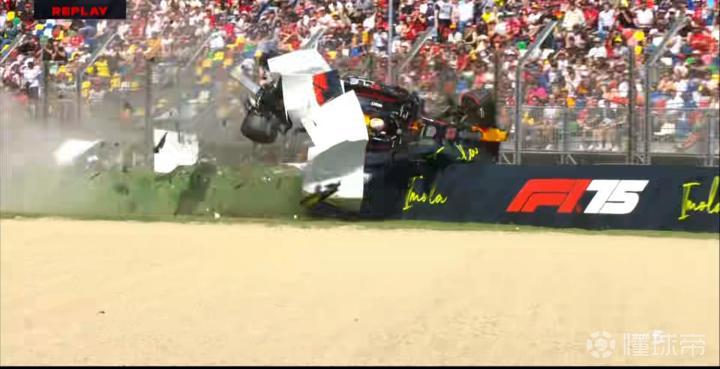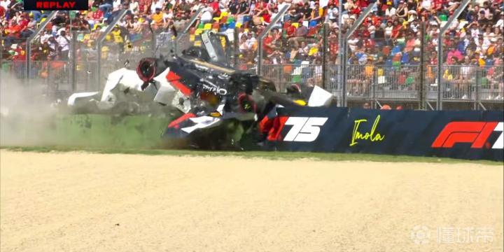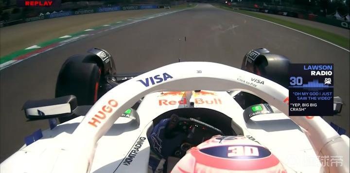 从回放来看,角田的赛车重重地拍在轮胎墙上,同时出现了翻滚!
