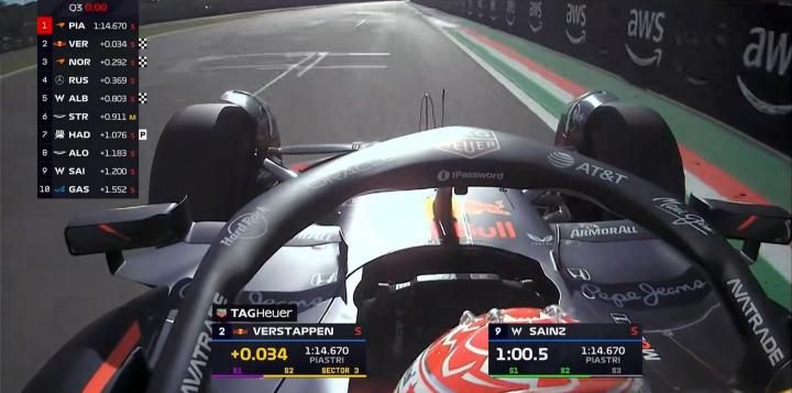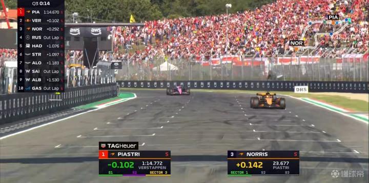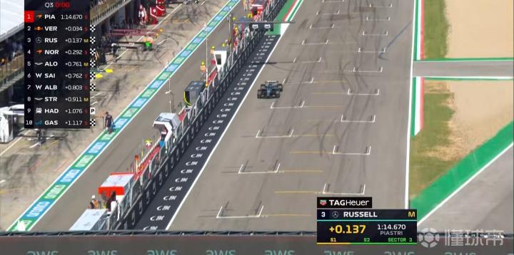维斯塔潘的后两段未能做出个人最快,以0.034秒的微弱劣势排在第2位,皮亚斯特里夺得今年的第三个杆位!
