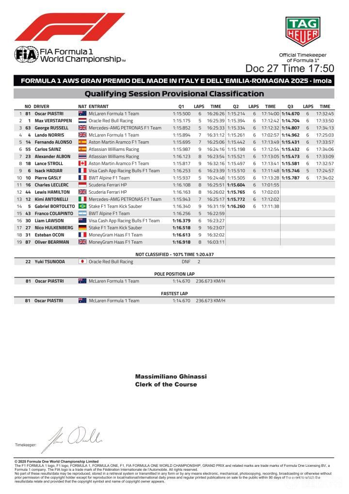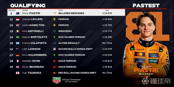 F1伊莫拉站排位赛:皮亚斯特里杆位,法拉利双车Q2出局,科拉平托上墙