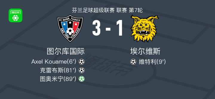 北京时间5月17日,芬兰足球超级联赛第7轮,图尔库国际主场迎战埃尔维斯。比赛中,图尔库国际由Axel Kouame率先建功,随后克雷布斯再下一城扩大优势。埃尔维斯方面,维特利为球队扳回一球。比赛尾声阶段,图奥米宁通过点球机会锁定胜局。最终,图尔库国际以3-1战胜埃尔维斯。