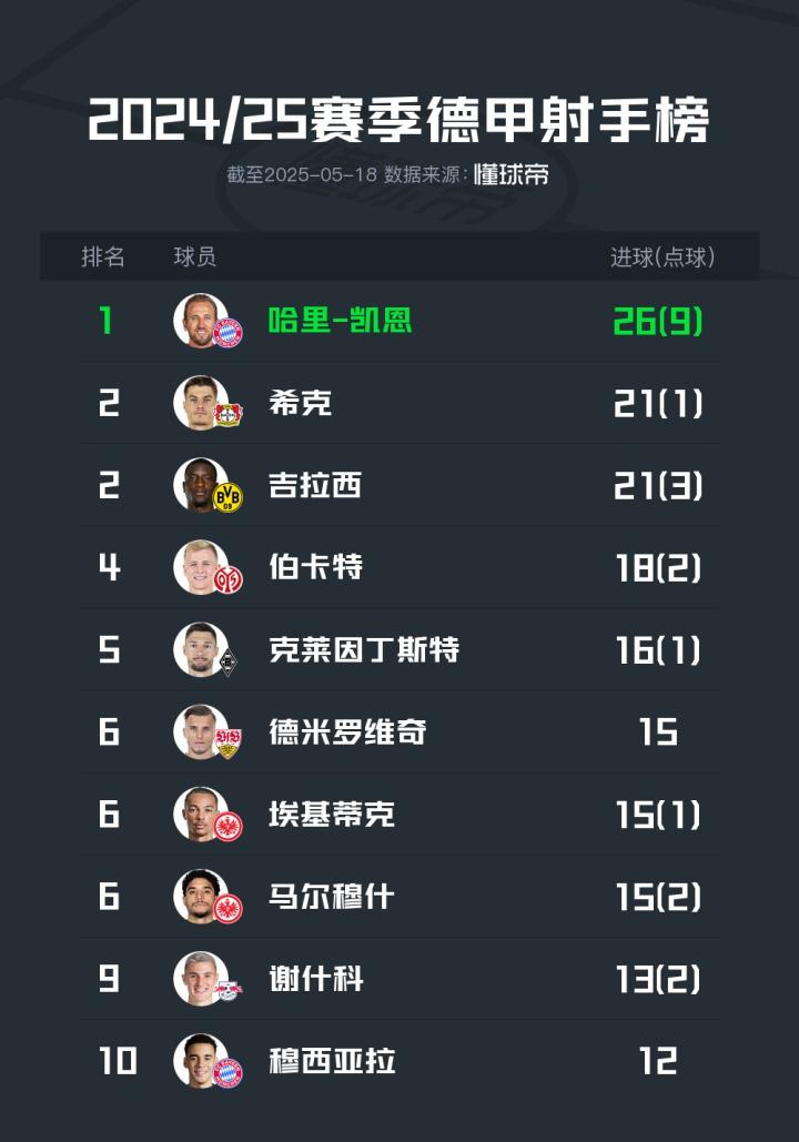 2024-25赛季德甲射手榜:凯恩荣膺“小钢炮”,希克、吉拉西排名第2于小6 @懂球帝2025-05-18 00:09北京时间5月17日晚间,德甲第34轮的比赛全部结束。最终,凯恩荣膺本赛季德甲射手王,本轮梅开二度的希克追上吉拉西并列射手榜第2位。展开更多
