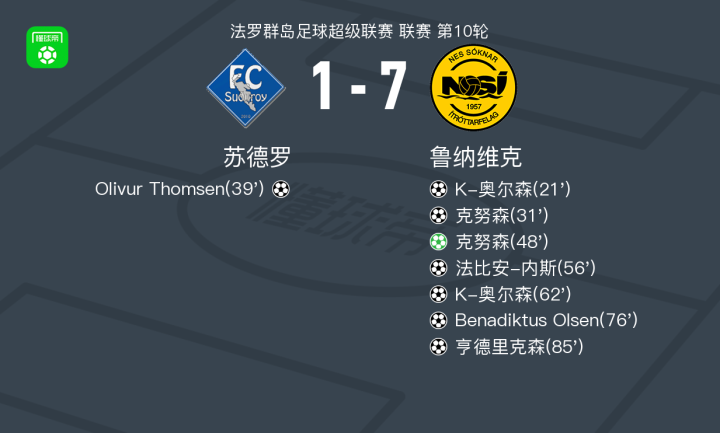 北京时间5月17日,法罗群岛足球超级联赛第10轮,苏德罗主场迎战鲁纳维克。比赛中,苏德罗由Olivur Thomsen打入一球。鲁纳维克方面,K-奥尔森表现出色完成梅开二度,克努森同样打入两球,法比安-内斯、Benadiktus Olsen和亨德里克森各有一球进账。最终,苏德罗以1-7不敌鲁纳维克。