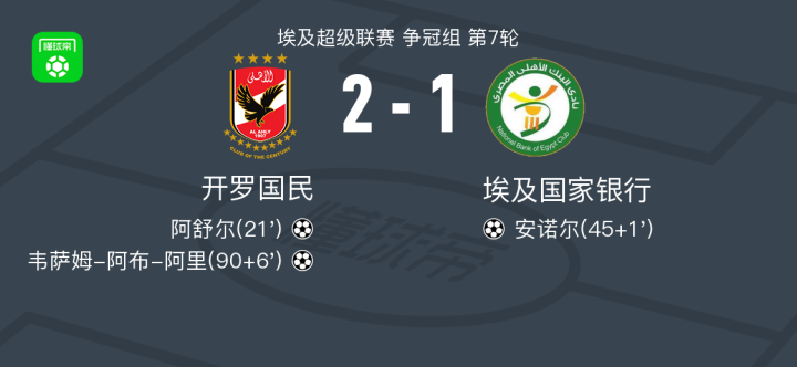 北京时间5月18日,埃及超级联赛争冠组第7轮,开罗国民主场迎战埃及国家银行。比赛中,开罗国民由阿舒尔率先建功,为球队取得领先。随后,埃及国家银行的安诺尔扳平比分。比赛最后阶段,韦萨姆-阿布-阿里打入制胜球,帮助开罗国民再度超出。最终,开罗国民2-1战胜埃及国家银行。