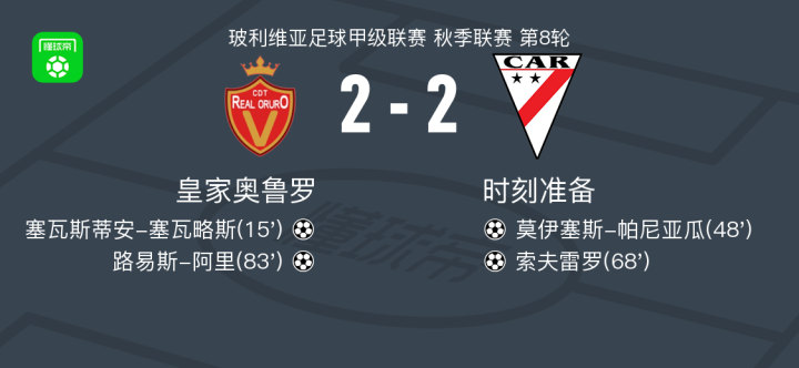 北京时间5月18日,玻利维亚足球甲级联赛秋季联赛第8轮,皇家奥鲁罗主场迎战时刻准备。比赛中,皇家奥鲁罗的塞瓦斯蒂安-塞瓦略斯率先建功,为球队取得领先。随后,时刻准备的莫伊塞斯-帕尼亚瓜扳平比分,索夫雷罗再下一城反超比分。不过,皇家奥鲁罗的路易斯-阿里在比赛后段打入一球,帮助球队最终将比分定格在2-2,双方握手言和。