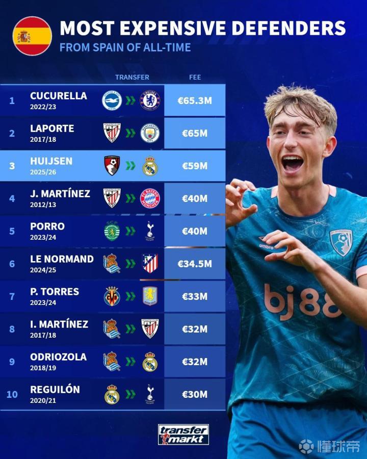 皇家马德里激活了赫伊森5000万镑的解约条款签下这位西班牙后卫,德国转会市场网站列出了西班牙后卫单次转会费排行,库库雷利亚以6530万欧居首,赫伊森以5900万欧列第三。