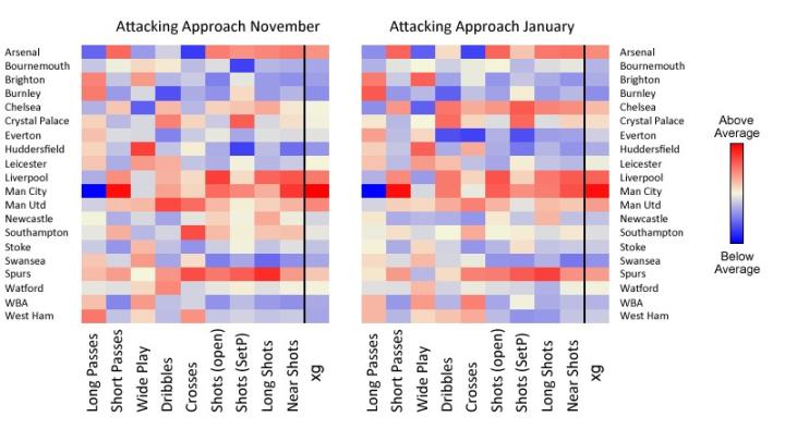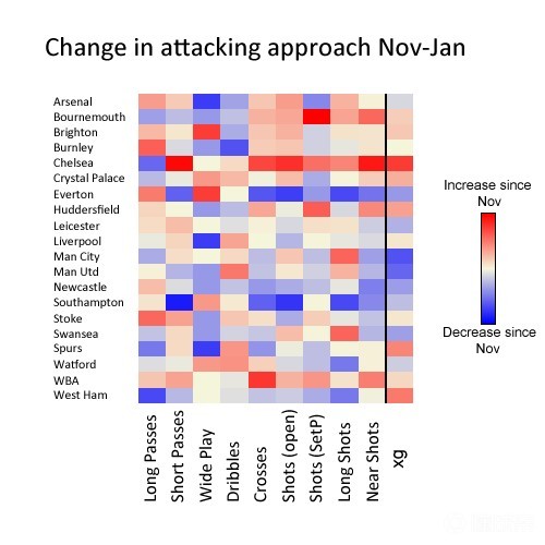 (图2:11月份和1月份英超各支球队进攻手段细项表现热图,越红则代表这一项越高于联赛平均水平,蓝色则与之相反)