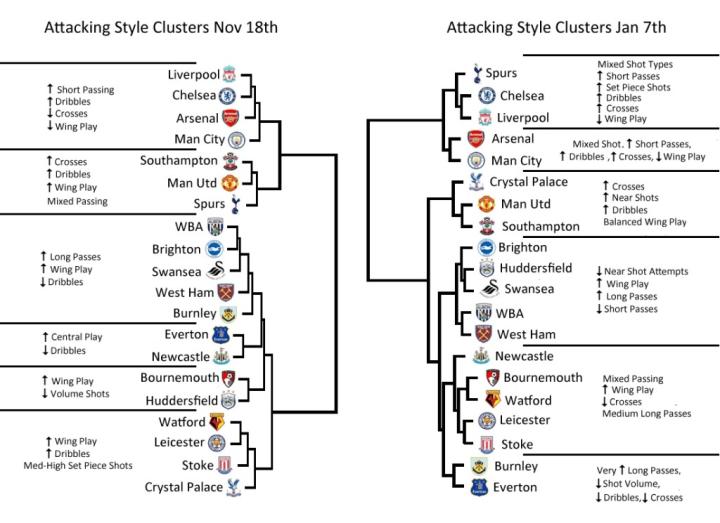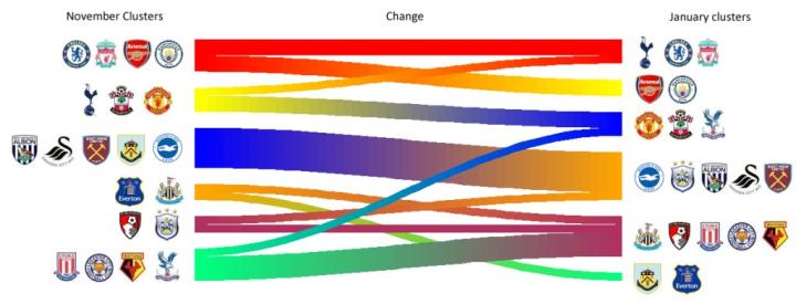 相比于11月份,图3显示了拥有相似进攻风格的球队是如何变换了他们的进攻风格的。如前所述,最明显的一个特征就是11月份时分组相同的球队在1月份统计时通常仍然会在一个群组里。几个较为大的变化是——水晶宫队现在和曼联、南安普顿处于同一个分组(他们组球队的积分榜排名位置比较分散),埃弗顿现在和戴奇的伯恩利处于相同的分组(他们两队的主帅都是极端的实用主义)。