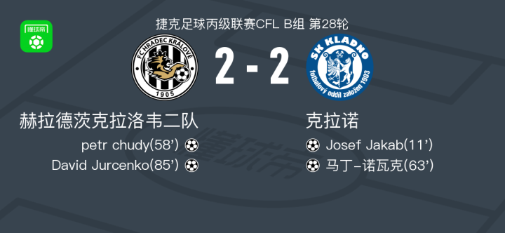 赫拉德茨克拉洛韦二队2-2克拉诺,Josef Jakab首开记录,David Jurcenko救主