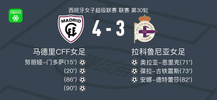 北京时间5月18日西班牙女子超级联赛 联赛 第30轮,马德里CFF女足主场对阵拉科鲁尼亚女足。马德里CFF女足努丽娅-门多萨破门。拉科鲁尼亚女足奥拉亚-恩里克破门,葆拉-古铁雷斯破门,安娜-德特蕾莎破门。最终比分马德里CFF女足 4-3 拉科鲁尼亚女足。