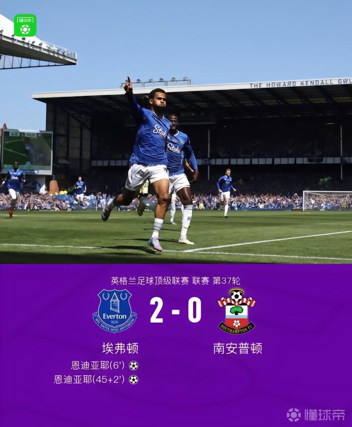 北京时间5月18日英格兰足球顶级联赛 联赛 第37轮,埃弗顿主场对阵南安普顿。埃弗顿恩迪亚耶梅开二度。最终比分埃弗顿 2-0 南安普顿。