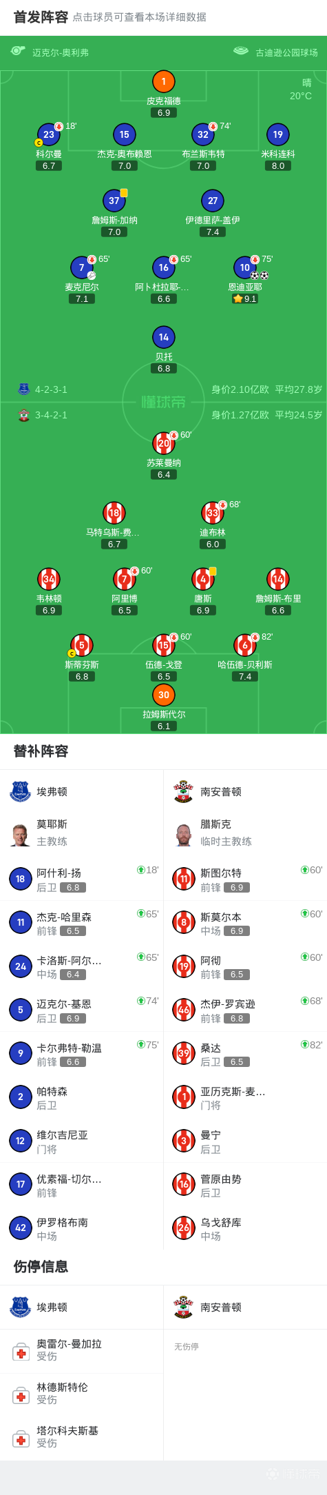 埃弗顿2-0南安普顿,恩迪亚耶双响,贝托两球被吹