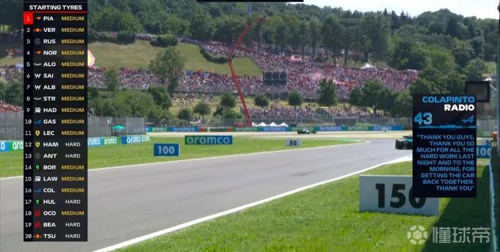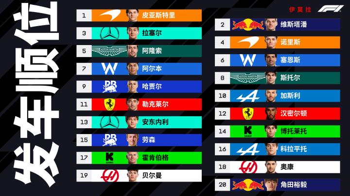 皮亚斯特里、维斯塔潘头排起步,科拉平托被罚退至第16位,角田裕毅维修区起步。