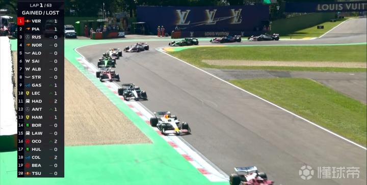 第1圈:维斯塔潘在3号弯前晚刹车超越皮亚斯特里,拿到领先的位置!