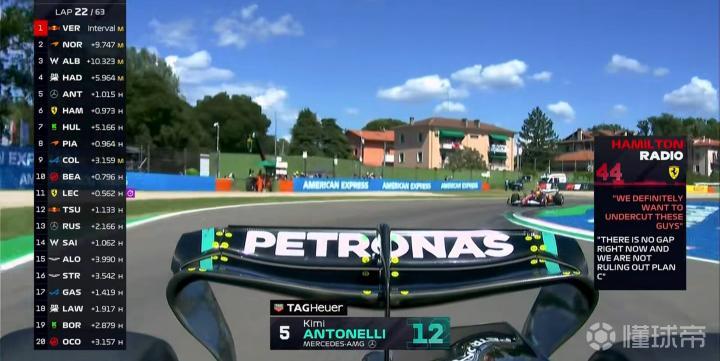 第22圈:汉密尔顿迟迟未能超越安东内利并想要尝试undercut,Ricky告知汉密尔顿目前如果进站的话,出来没有干净的窗口;