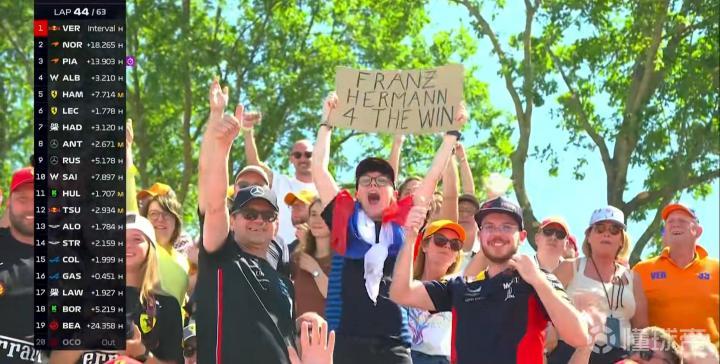 第44圈:小车迷举着弗朗茨-赫尔曼夺冠的纸牌,维斯塔潘在上周测试GT3赛车时使用这一化名;