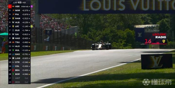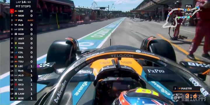 第14圈:皮亚斯特里提前执行一停,出来后的窗口很干净,保持在勒克莱尔身前,但车队换了个3.6秒,减轻了维斯塔潘的压力;