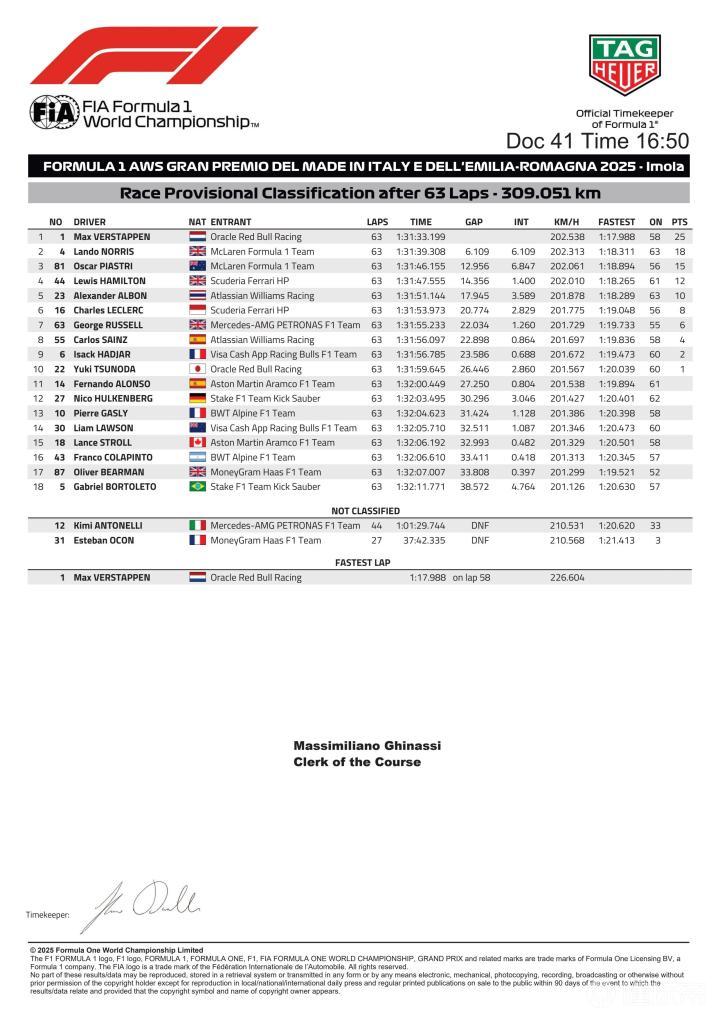 F1伊莫拉站正赛:维斯塔潘夺冠,诺里斯第2,汉密尔顿第4